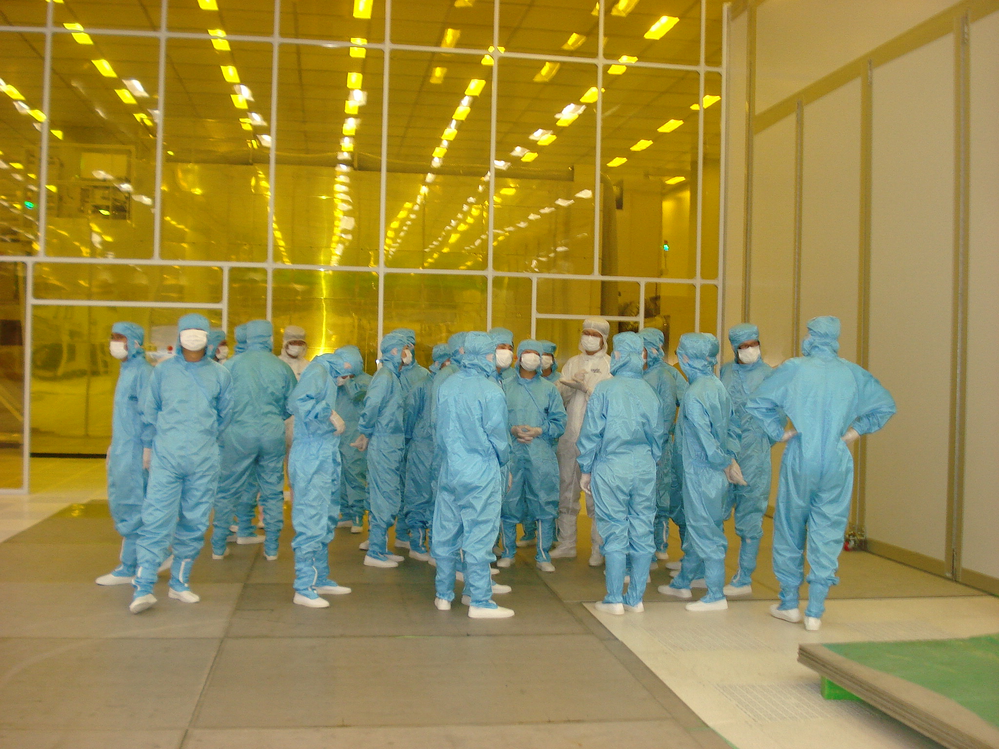 接下来我们进入了我们今天主要的参观内容,就是洁净厂房的参观,参观之前我们都穿上了密封的防尘服,戴上口罩和手套。忧郁感冒的关系,在里面呼吸并不是很顺畅。没能感受里面洁净室的空气与外面的空气是否有所不同。